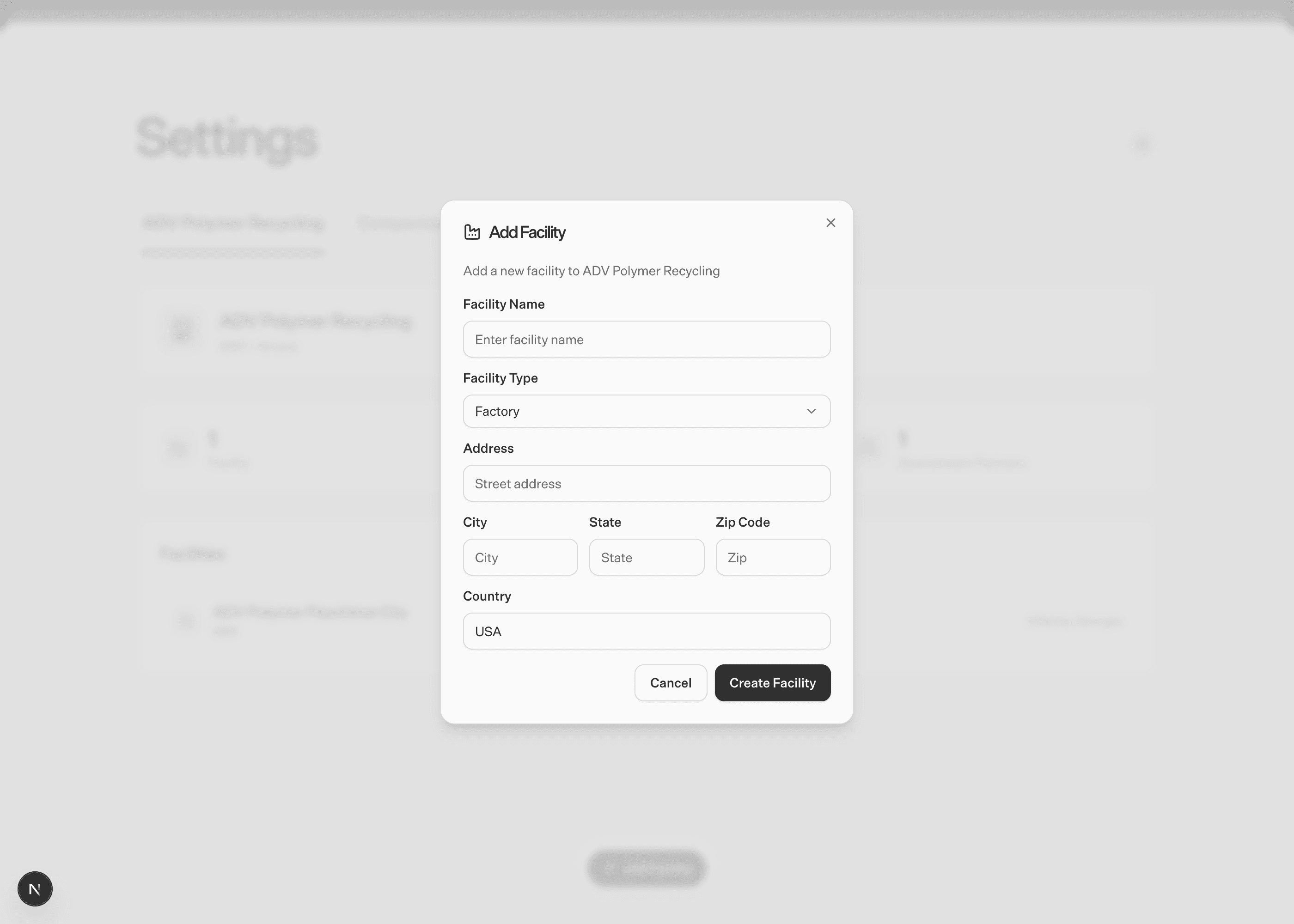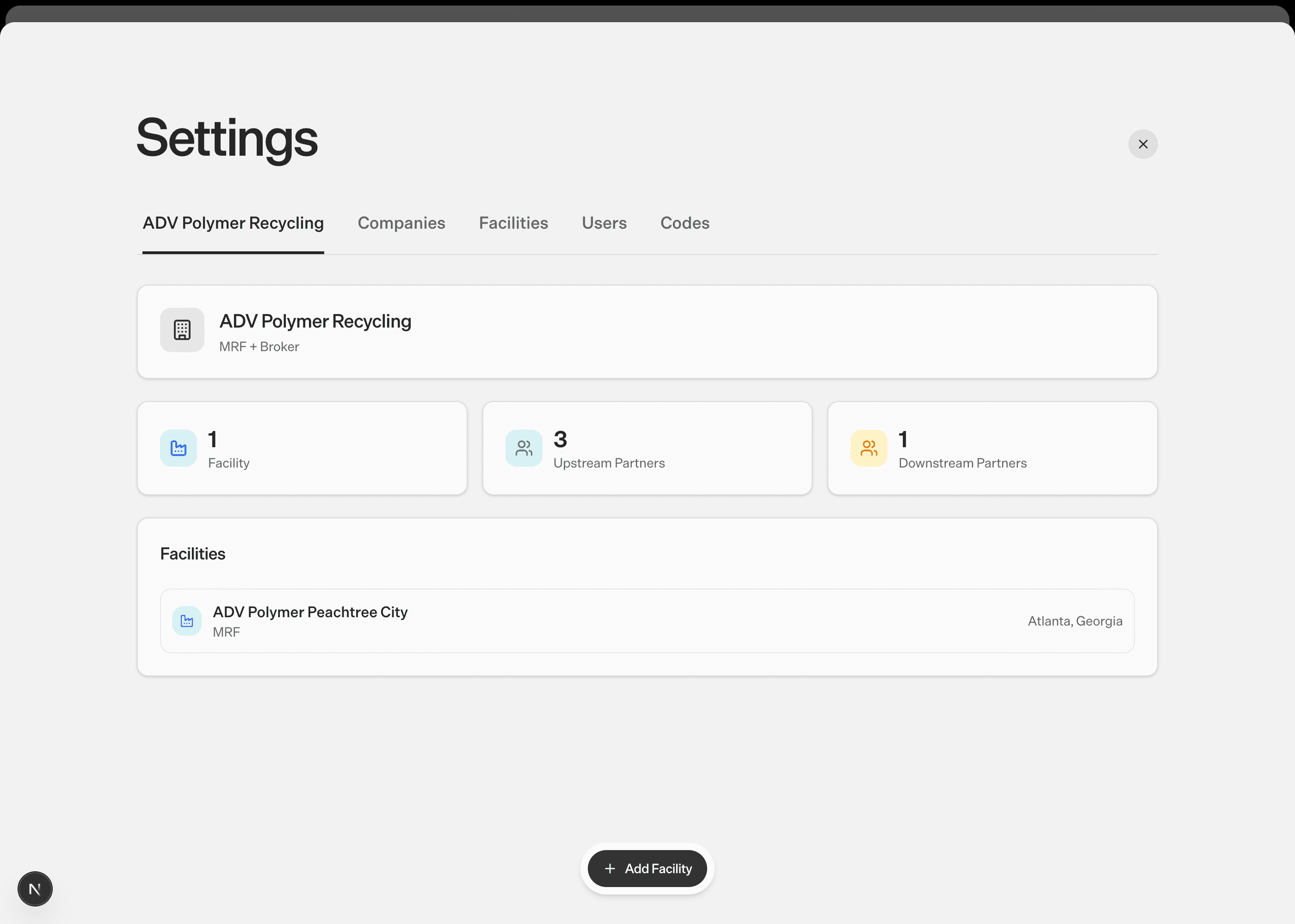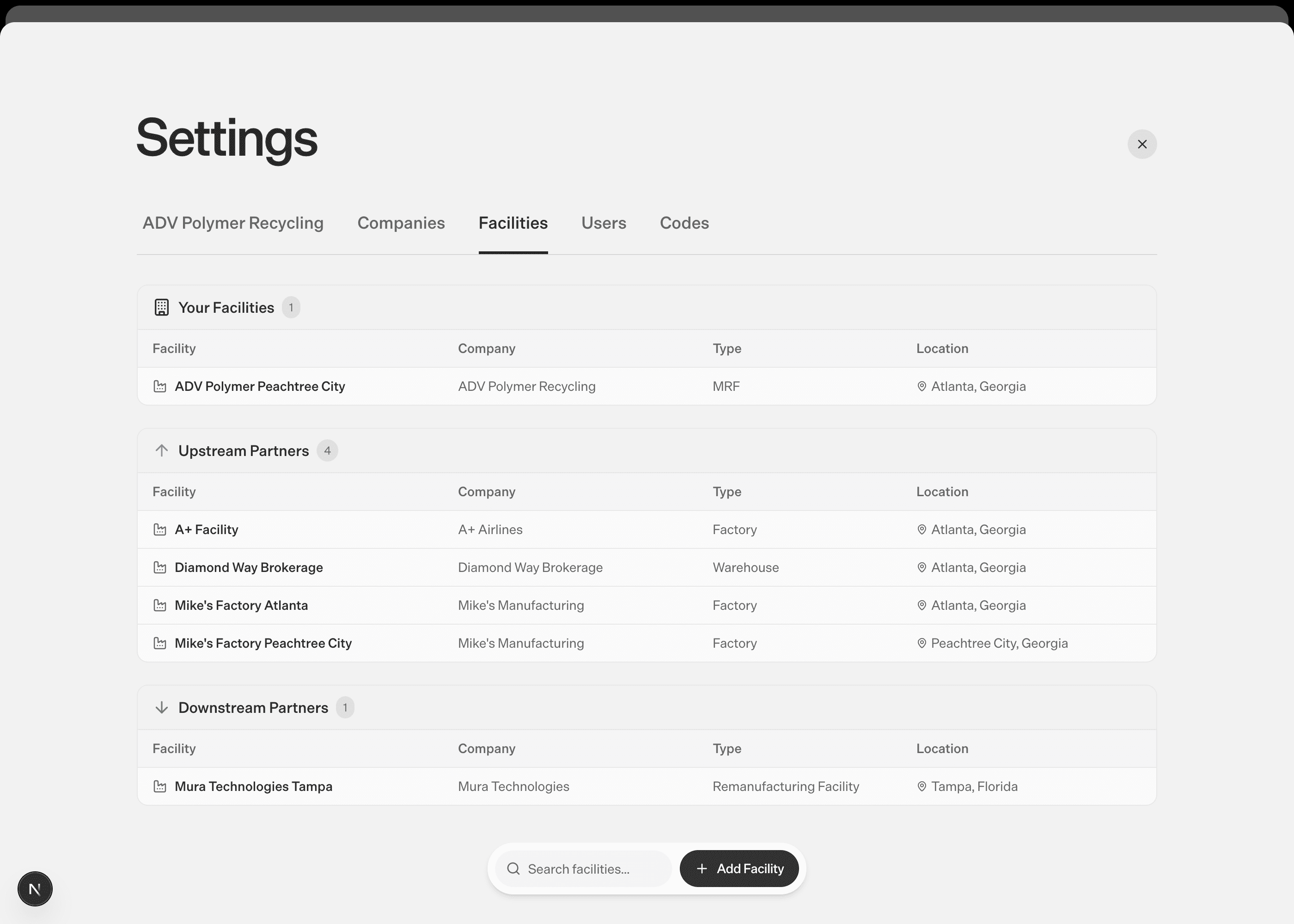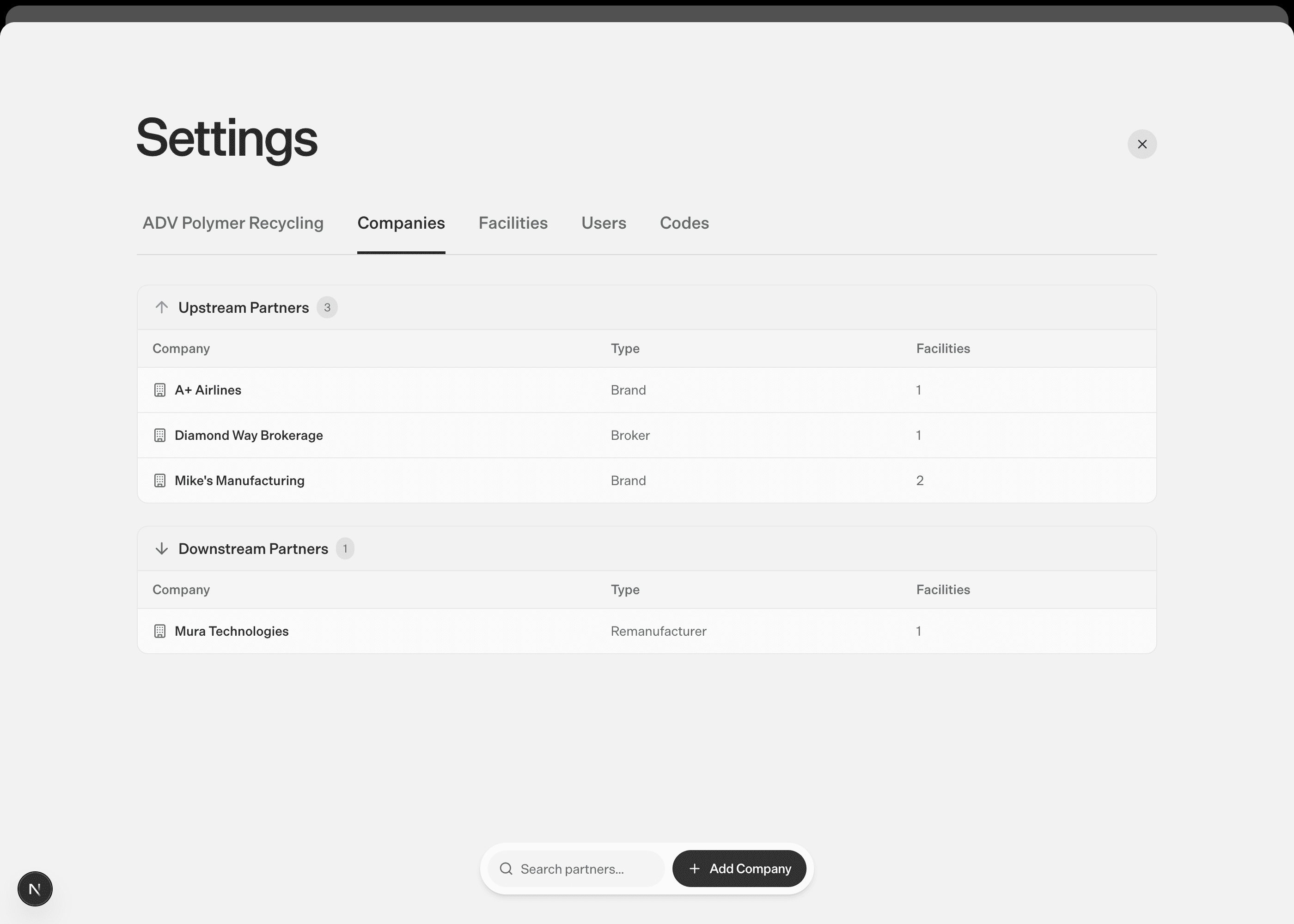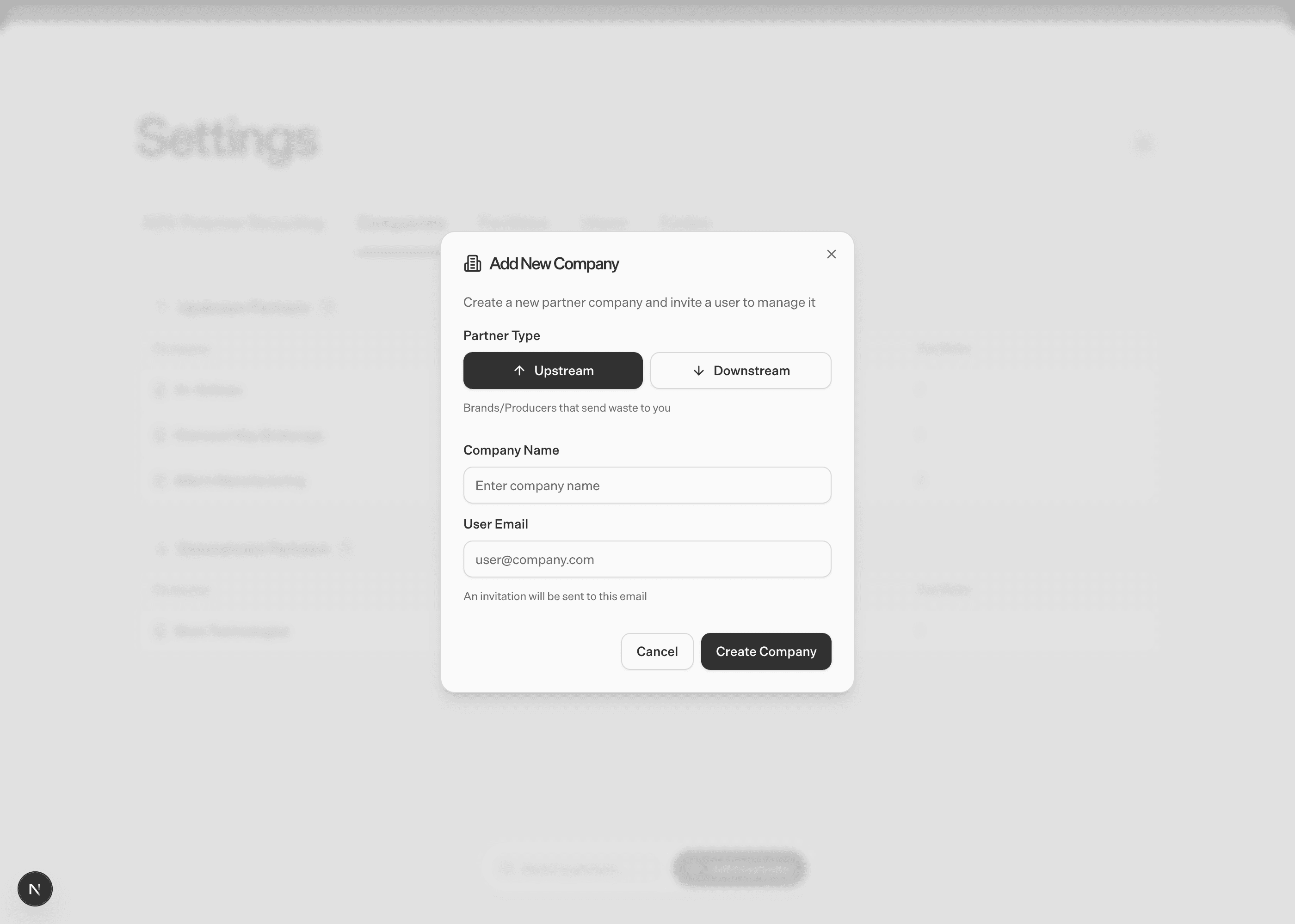 Click the Companies tab and then click the Add Company button at the bottom of the screen. Choose whether this is an upstream (brand) or downstream (processor, MRF, recycler etc) and fill out the information. You can provide an email to invite someone from the company to view their portal. You can also invite more people later.