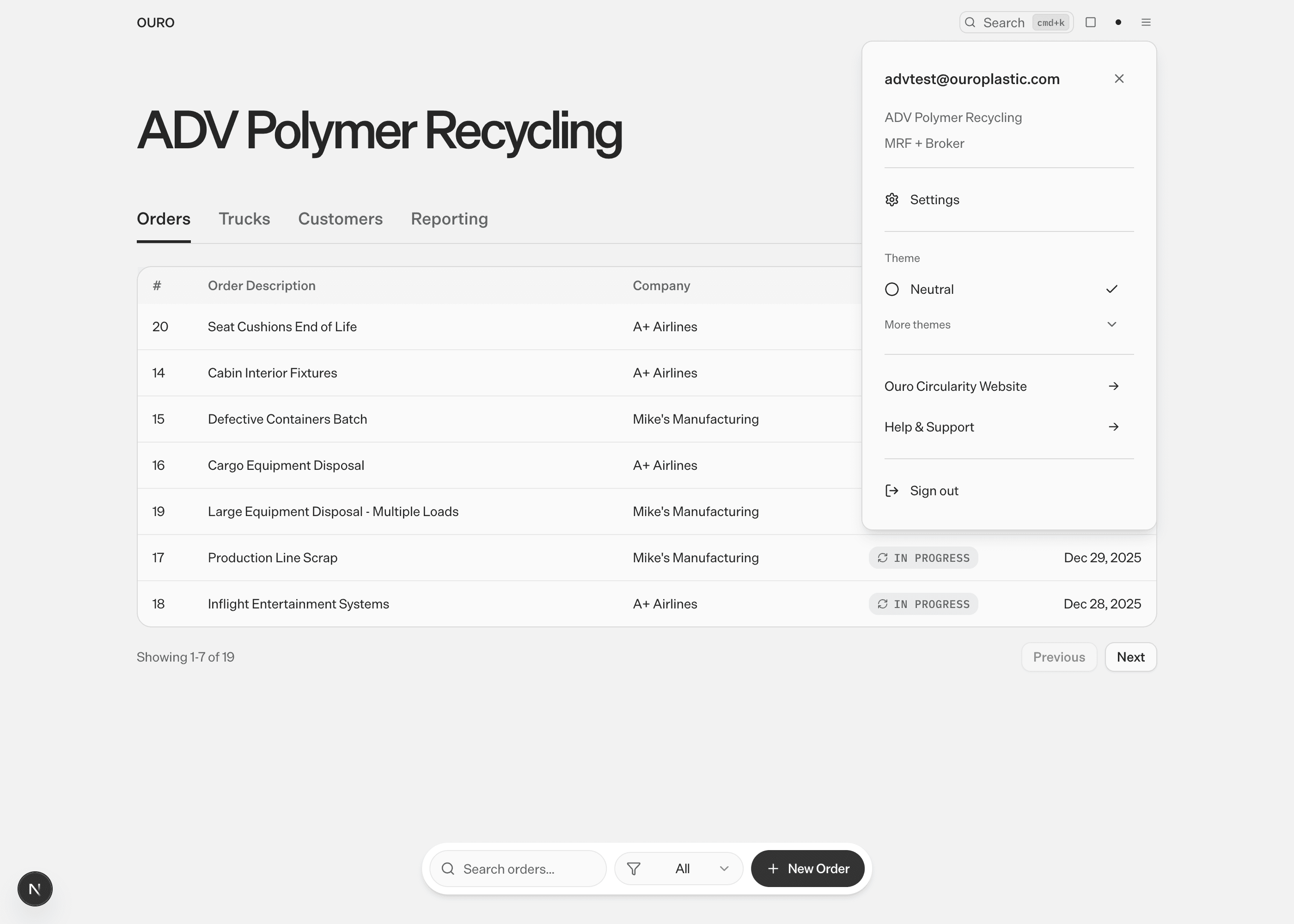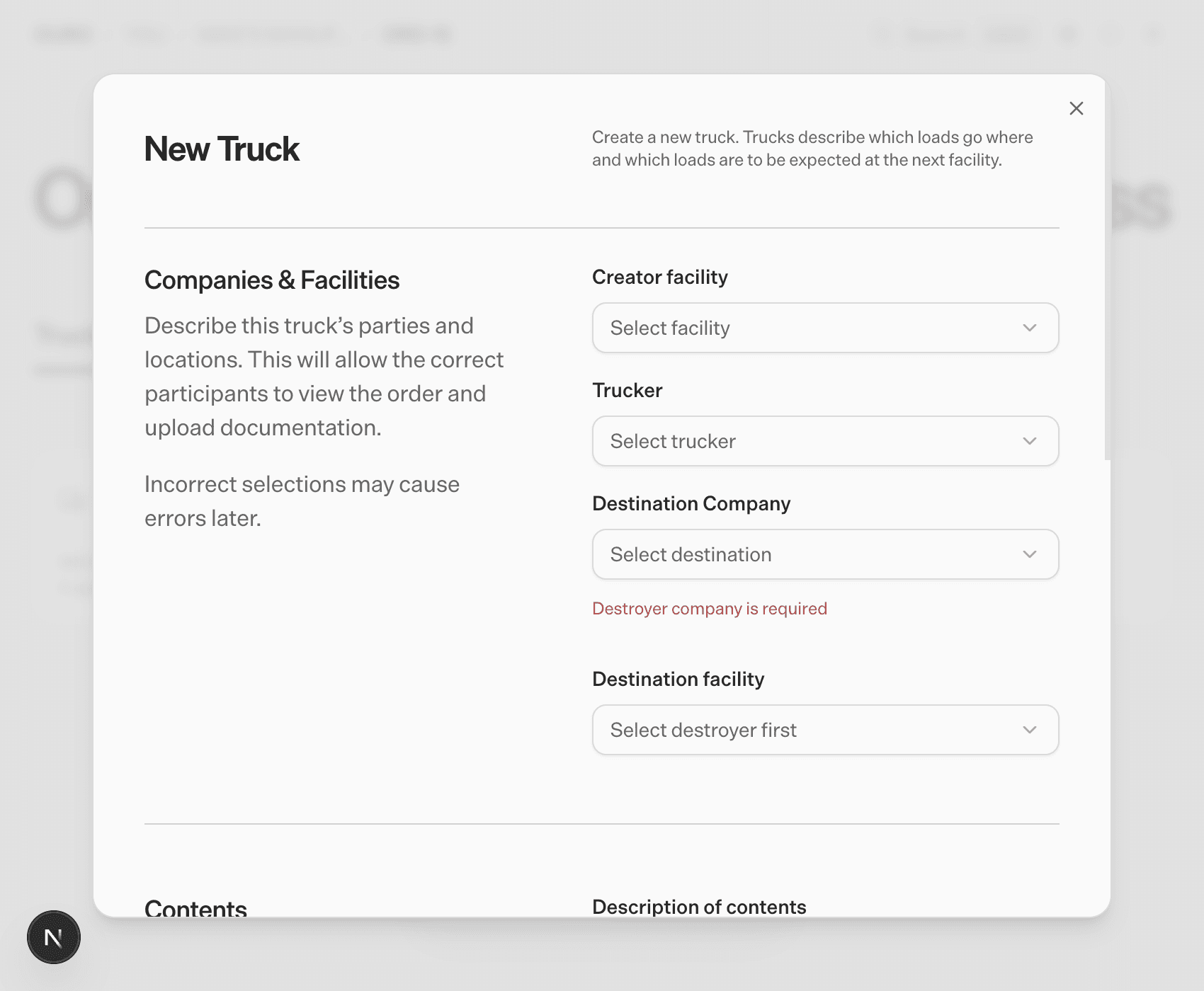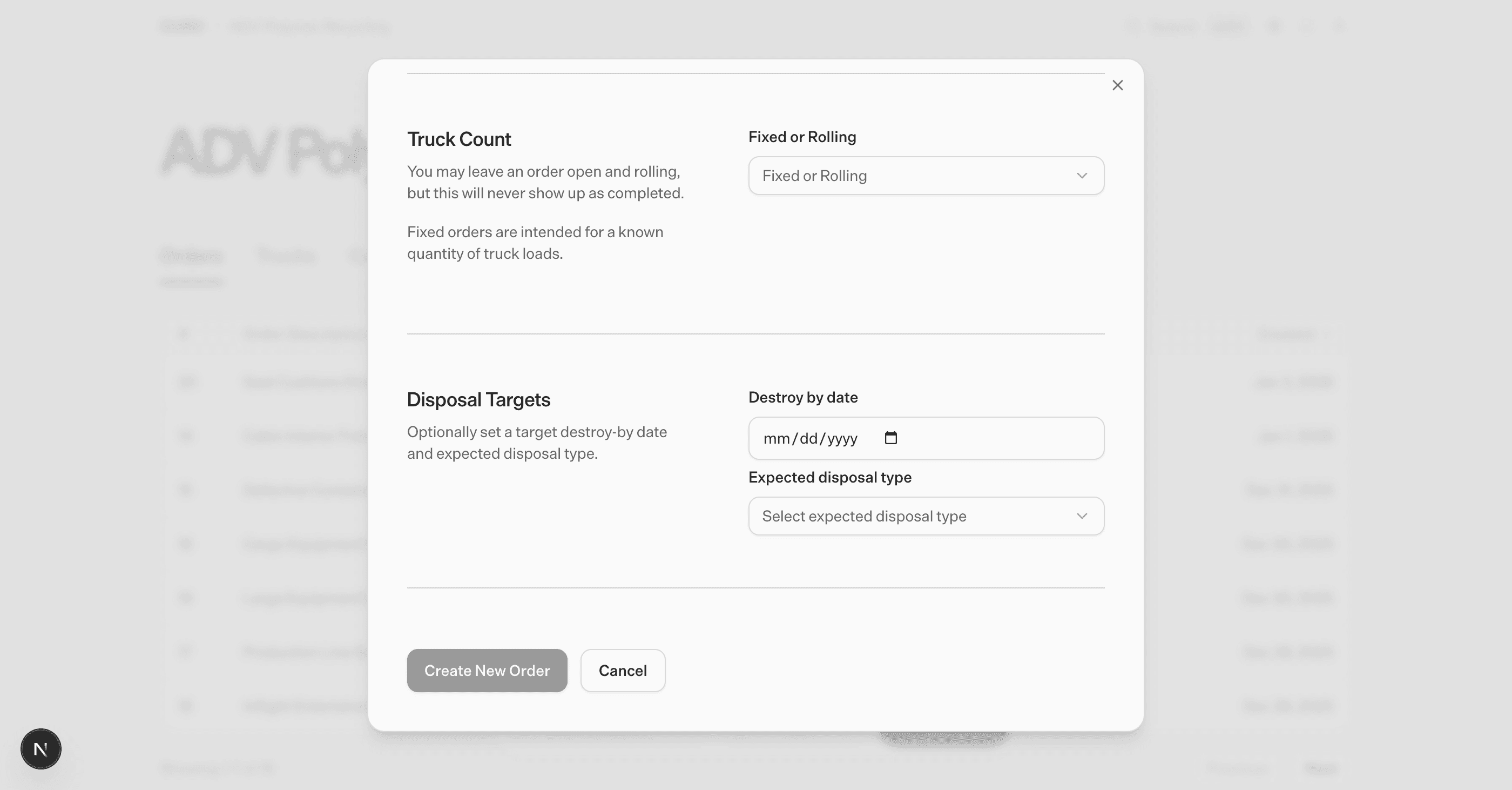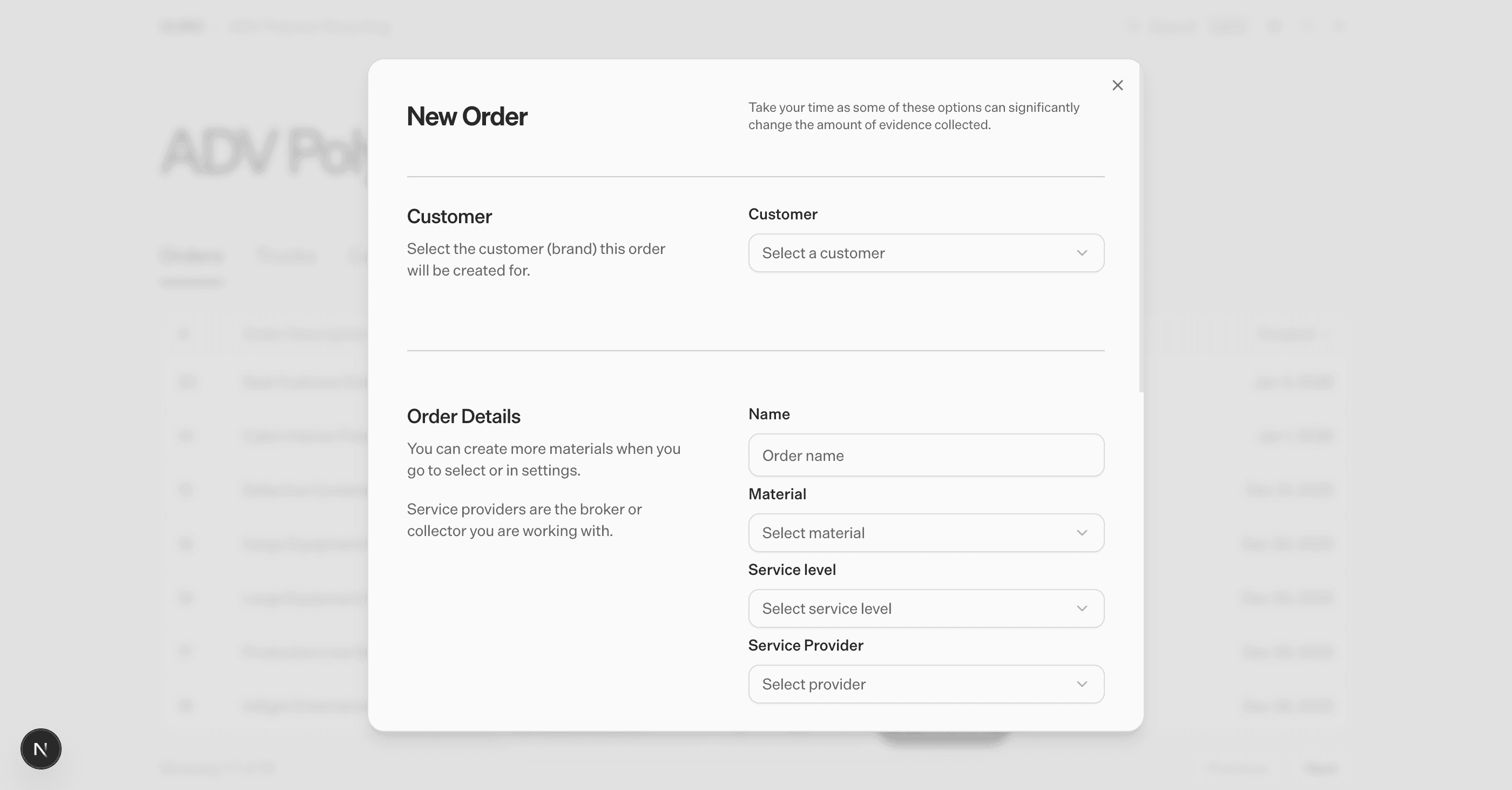 Creating a new order is simple. As a broker + MRF, you can create orders for your customers. Select a company to receive material from and a facility that they are sending things from.