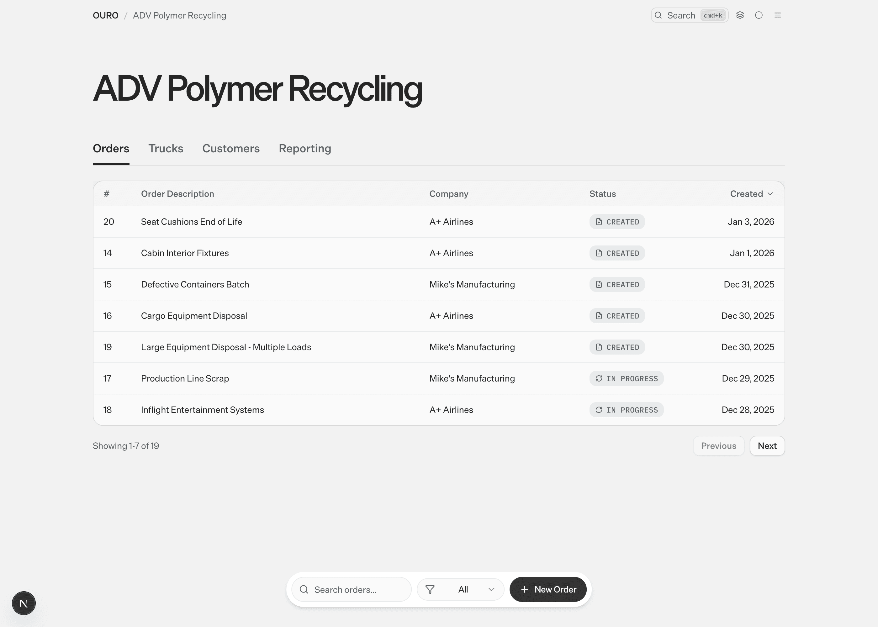 When you log in, you will be sent to the orders page. Here, you can sort your orders by company, activity status, or location.