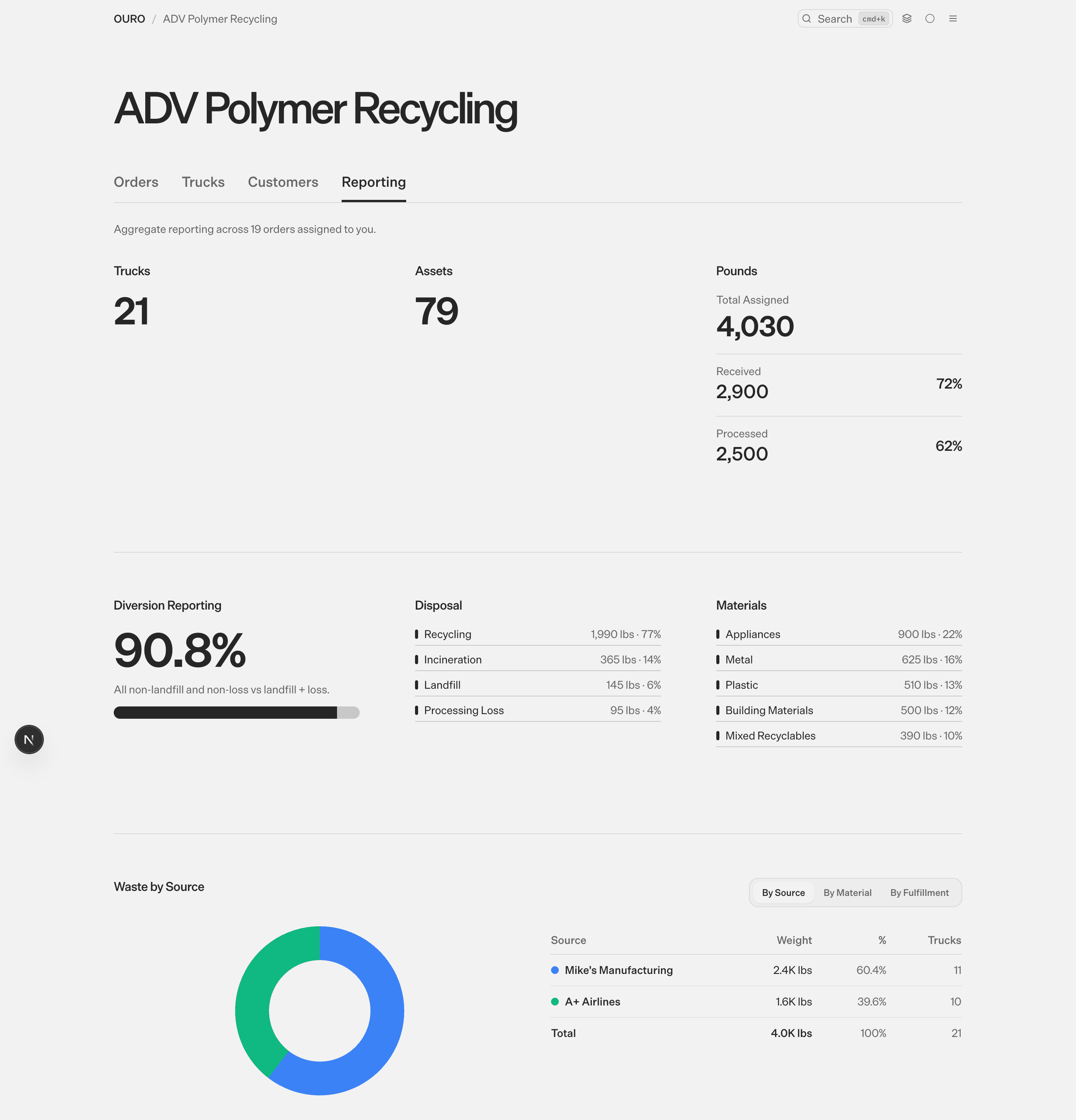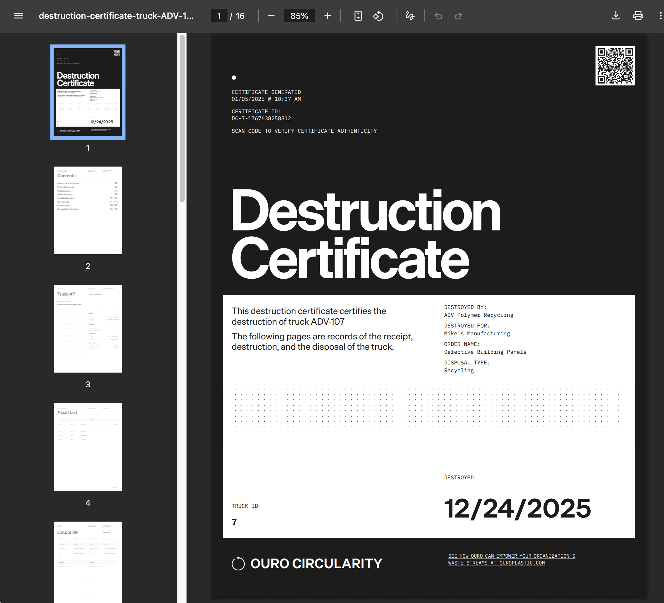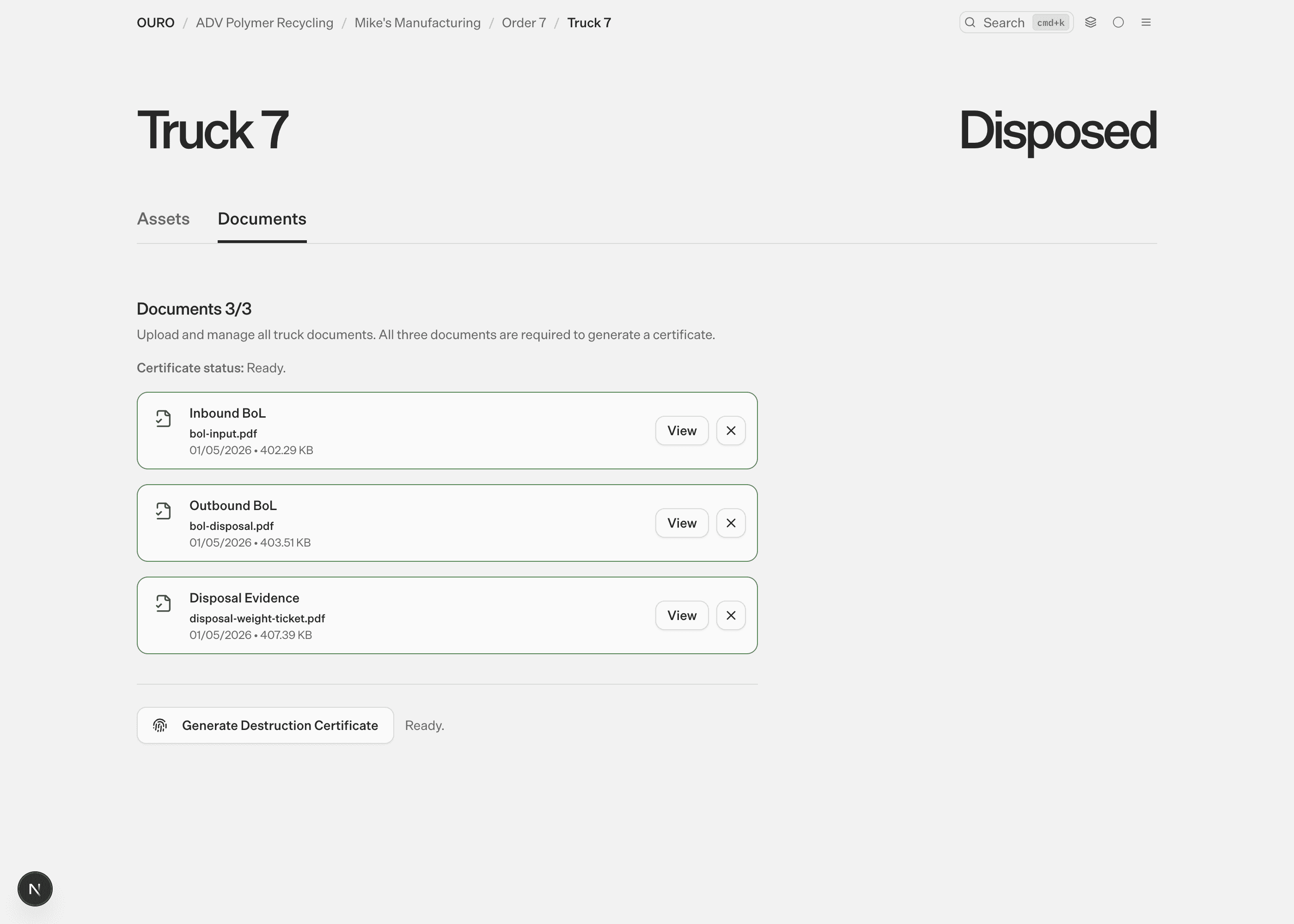 Premium fulfillment - Tracking starts at the producer of the waste (ie at a walmart facility). Each asset is tagged with a qr code. Objects must be scanned and weighed at each step. Requires a disposal certificate indicating receipt of the material.