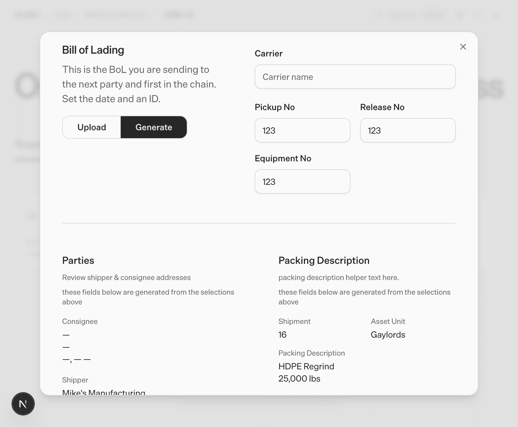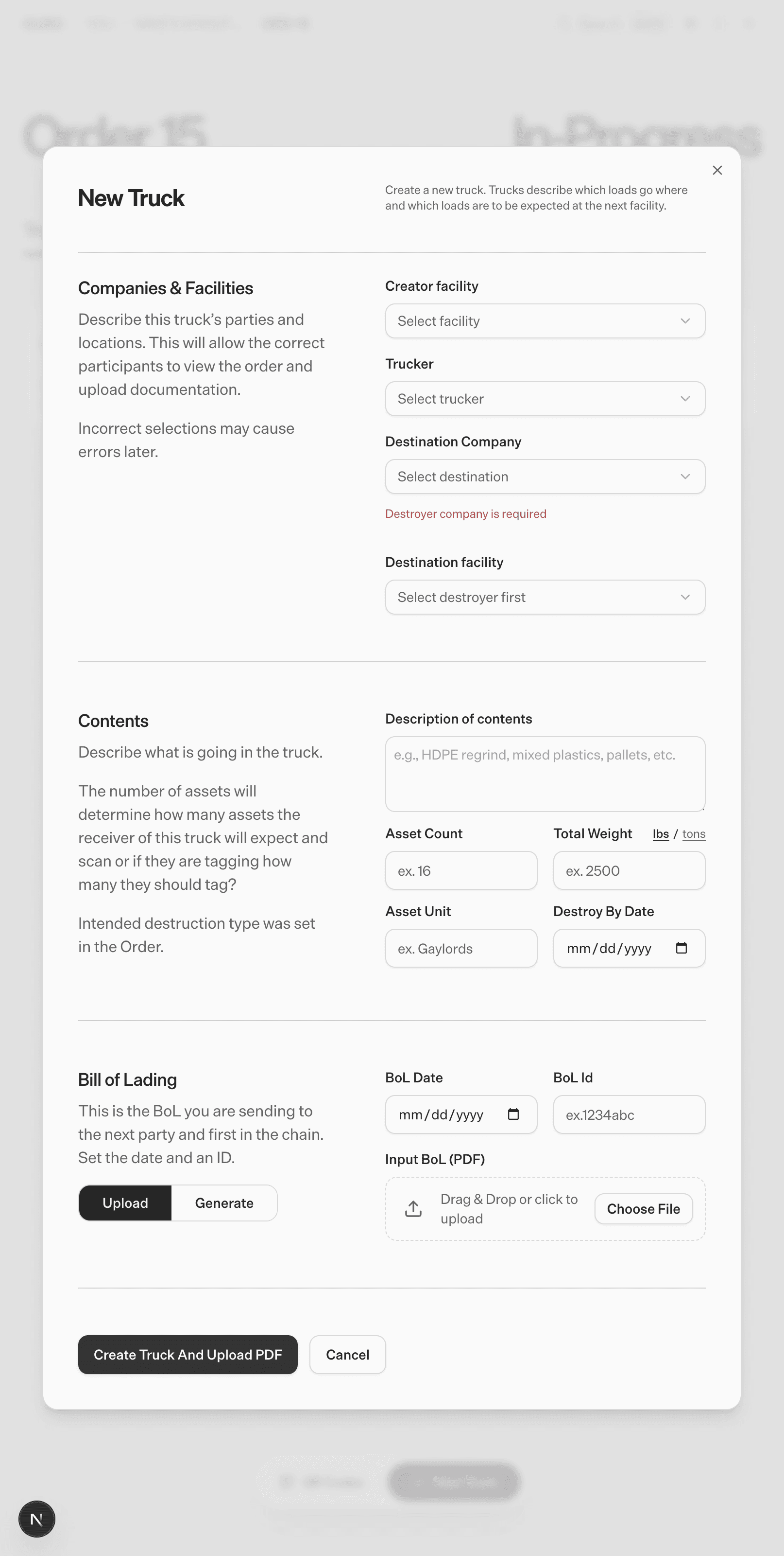 The bill of lading can either be uploaded as a pdf or generated through our system. A bill of lading must be created to generate a new truck.