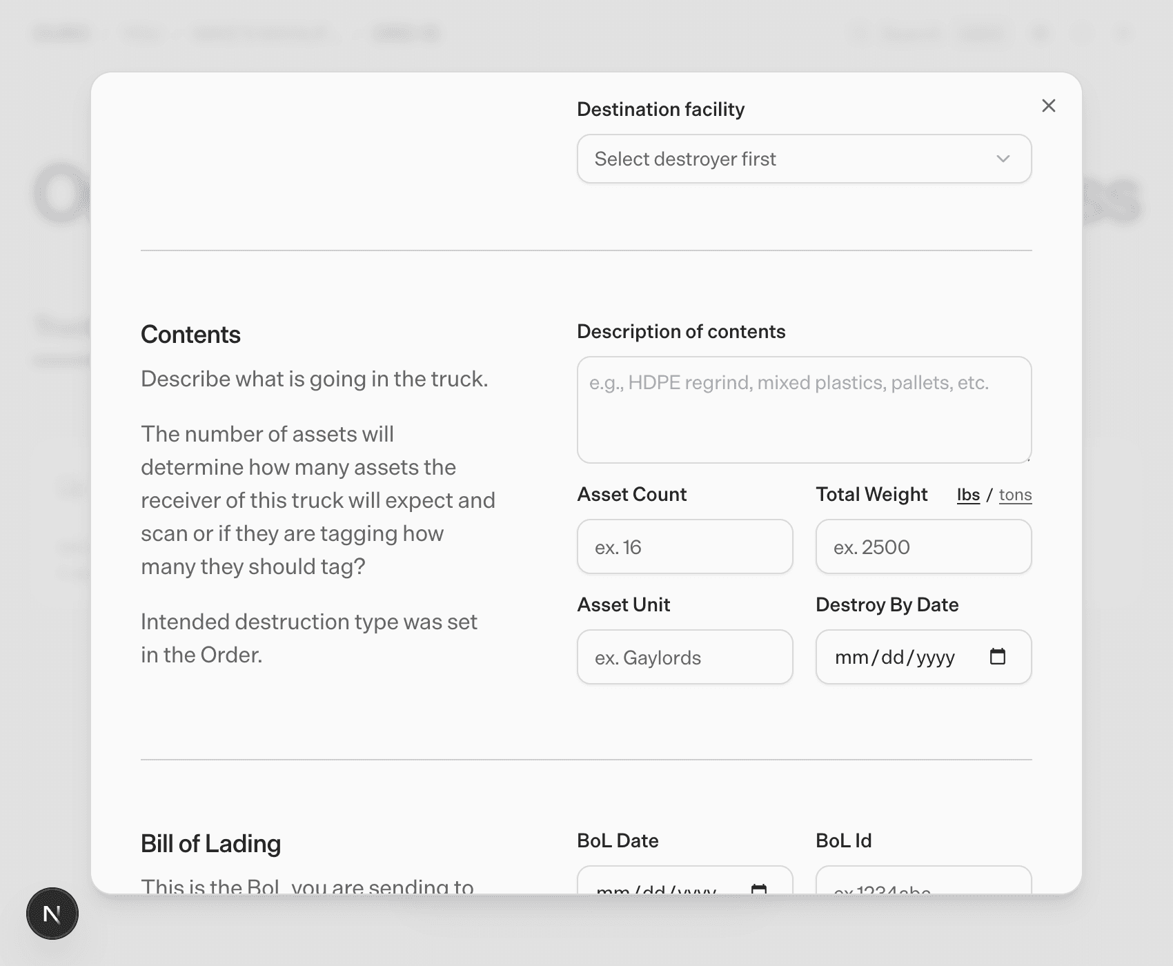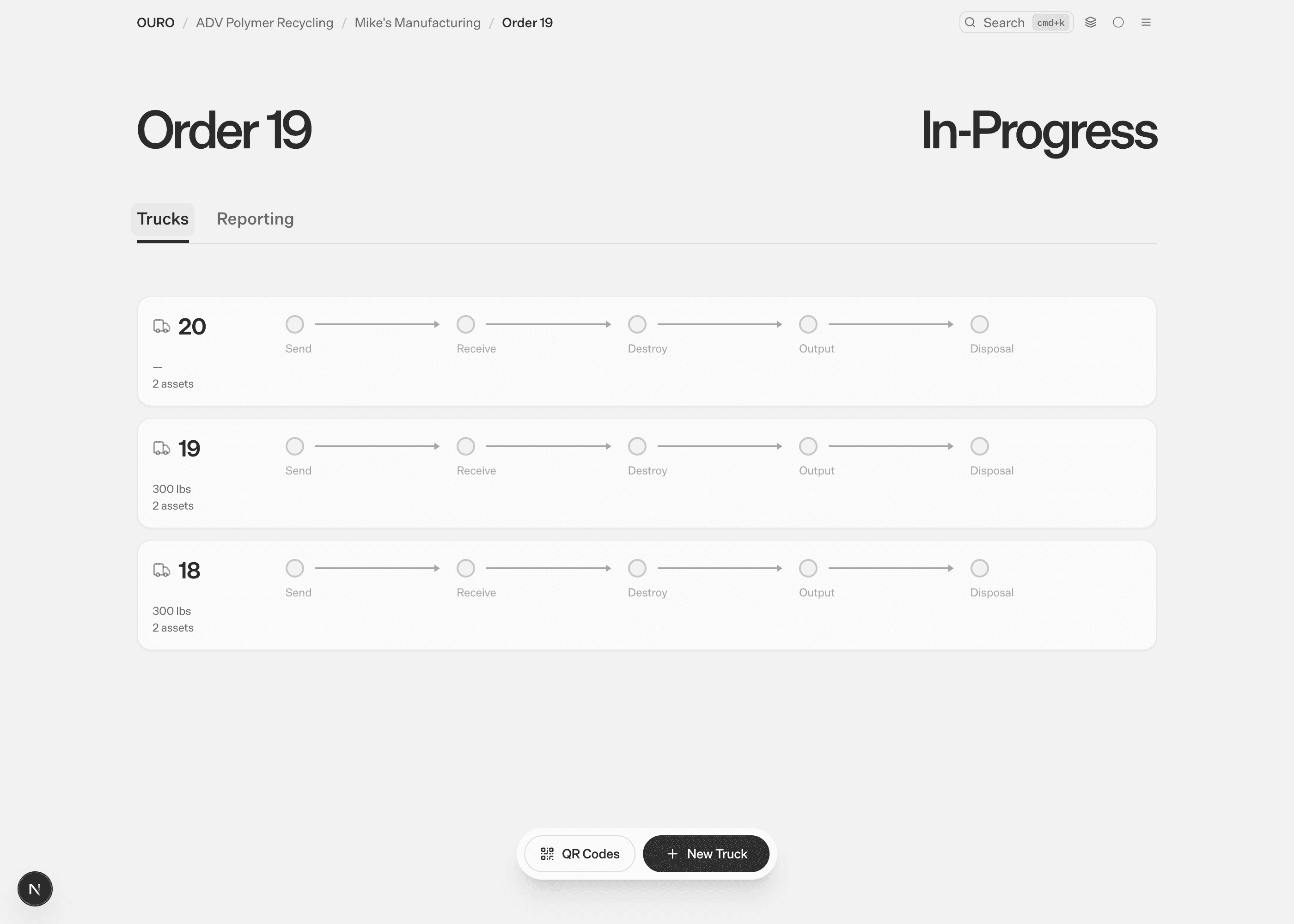 Standard fulfillment - Tracking starts at the destruction facility. No QR codes. There is a set number of objects and at the receipt and destruction we just take a video/photo for each object. No weighing of objects. Once objects are loaded on disposal truck the process is ended.