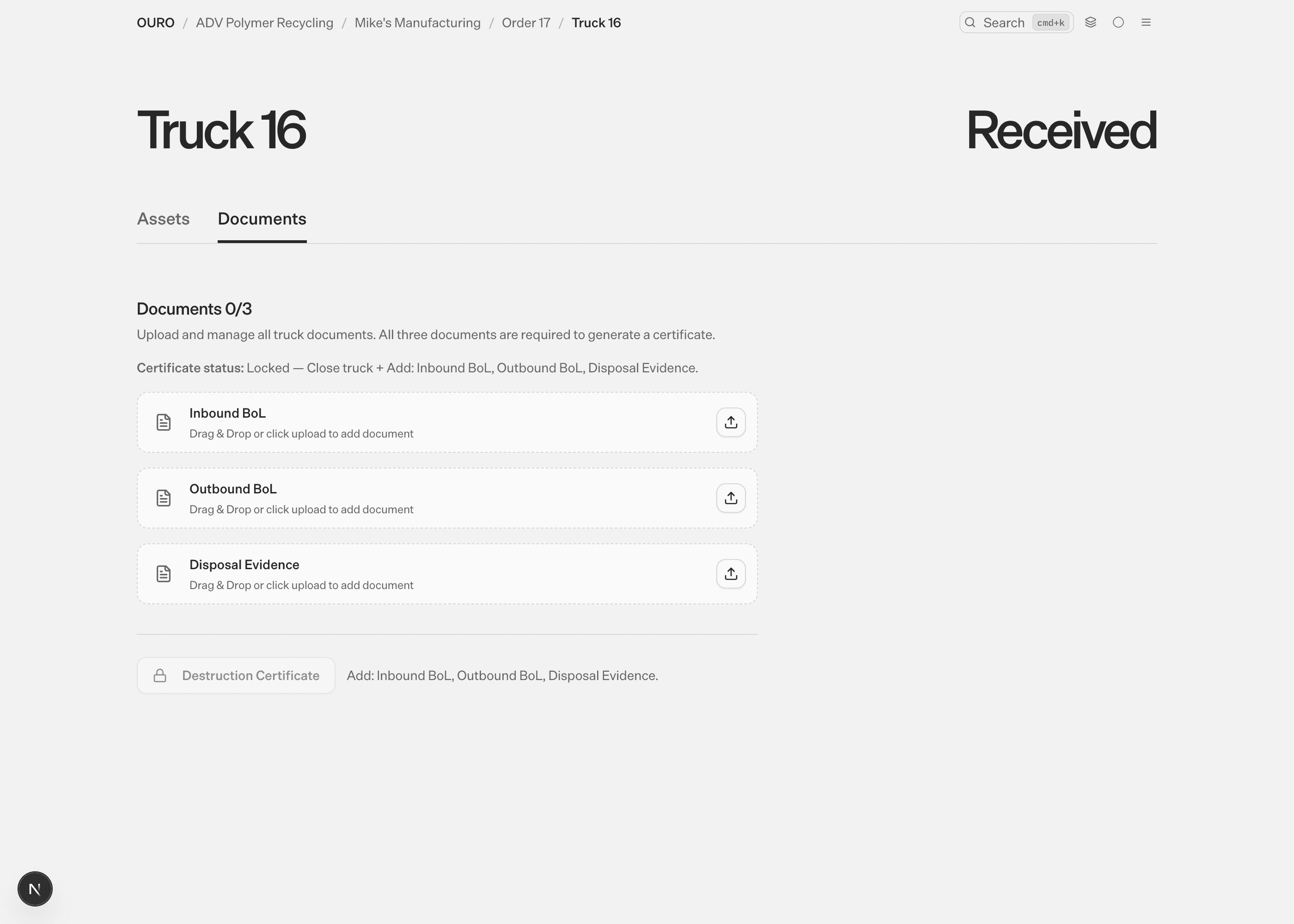 Once all the proper documents have been uploaded and all photos and videos have been collected, the generate certificate button on the documents tab of the truck will become available. Press this to generate a certificate of destruction which can be sent to partners or accessed via the platform by anyone with the credentials to log into these orders/trucks.